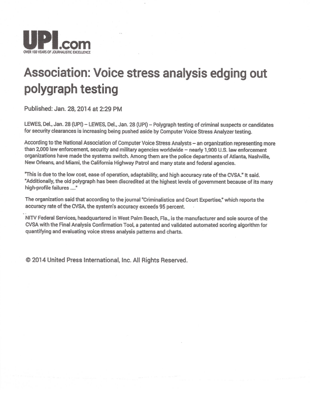 Lewes, DE — (SBWIRE) A newly published research study in the 2012 annual edition of the scientific journal Criminalistics and Court Expertise reports the accuracy rate of the Computer Voice Stress Analyzer (CVSA®) is greater than 95%, an assertion long made by the system’s manufacturer. The study’s results are further bolstered by current US Government funded voice analysis research which has established voice technologies performed well for border security applications.