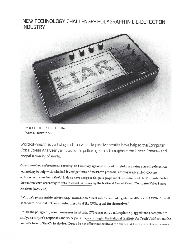 It is now legal for Texas law enforcement to utilize what has been described as “One of the most important investigative tools available today.” In the mid 1970’s the American Polygraph Association recognized the threat that the newly introduced voice stress analysis technology posed to its monopoly of the lie detection industry. The APA had its state affiliates introduce its ‘standard polygraph licensing act’ into their respective legislatures. Tucked away in the licensing act was the wording “No person shall use any instrument to determine truth or deception that does not permanently record the cardiovascular and respiratory patterns. The use of any other detection device is prohibited.” This wording outlawed ANY instrument other than the polygraph. Only 15 states adopted the polygraph licensing requirement.